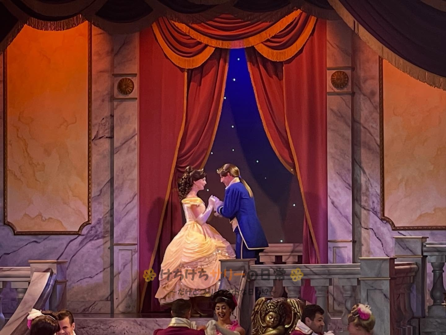 その時々でキャストさんが変わるんだけど、1回めちゃくちゃ演技力がすごくて、野獣が死にかけるシーンで『I love you』と泣きながら話しかけるシーンで感動して泣いてたら周りもみんな泣いてた事があった。同じショーでも見るお客さんやその時のキャストさんで全然違う雰囲気になるから何回見ても楽しめたよ😍
