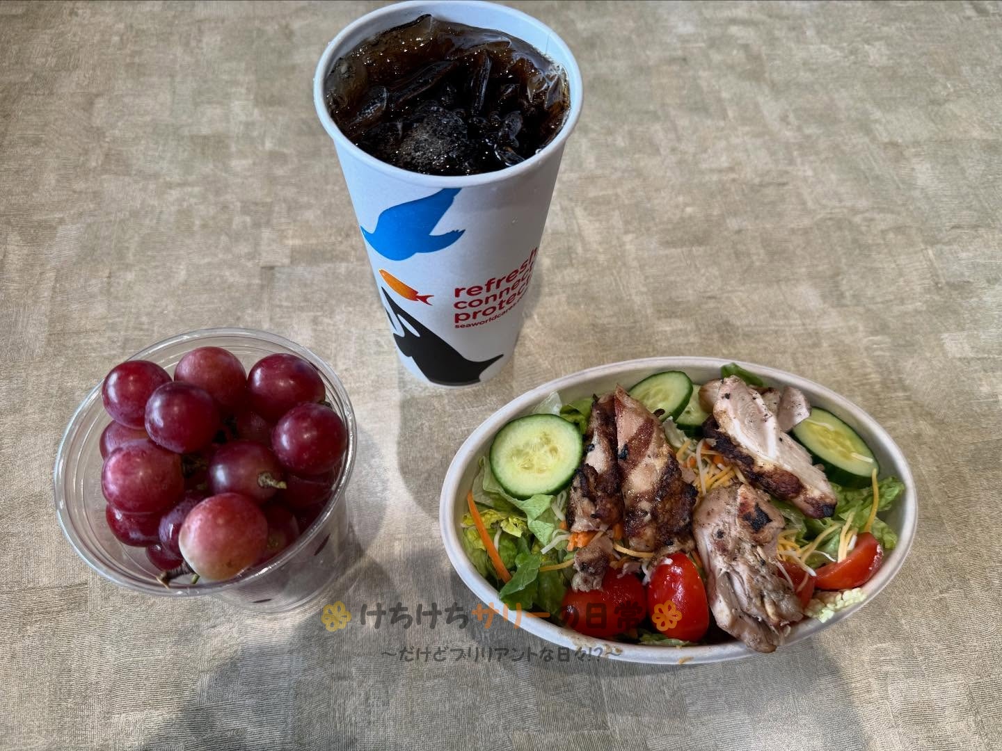 この日の食事は食べ放題プランを購入。90分毎に1セットをオーダーできるので、いろんなレストランを回って食べたよ!例えばこれはサラダとブドウ、飲み物のセット🥗