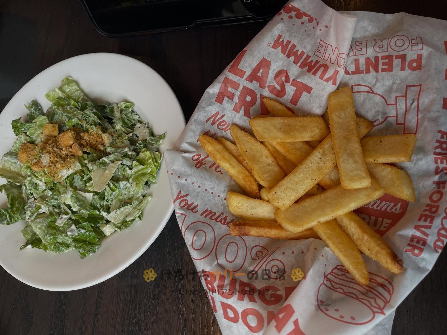 フライドポテトとサラダは食べ放題、ドリンクは飲み放題なのが嬉しい😊 ちなみにアメリカではこういうテーブルサービスのお店ではソフトドリンクが飲み放題だっていうのも出張の時に教えてもらって知った🇺🇸