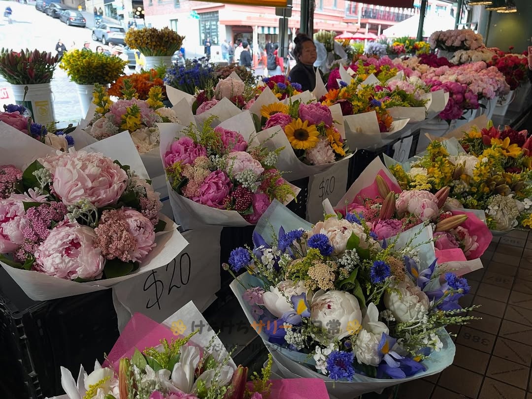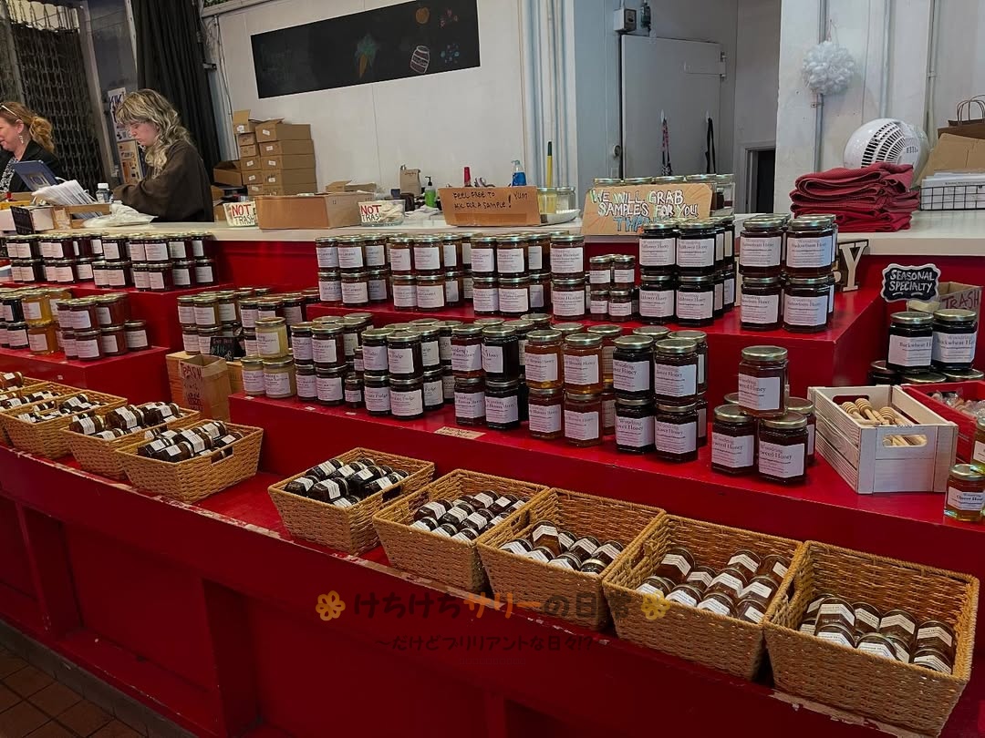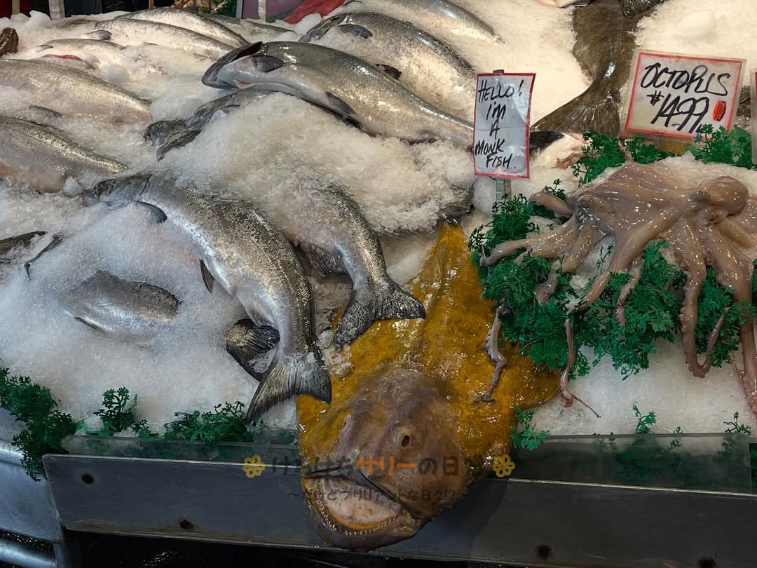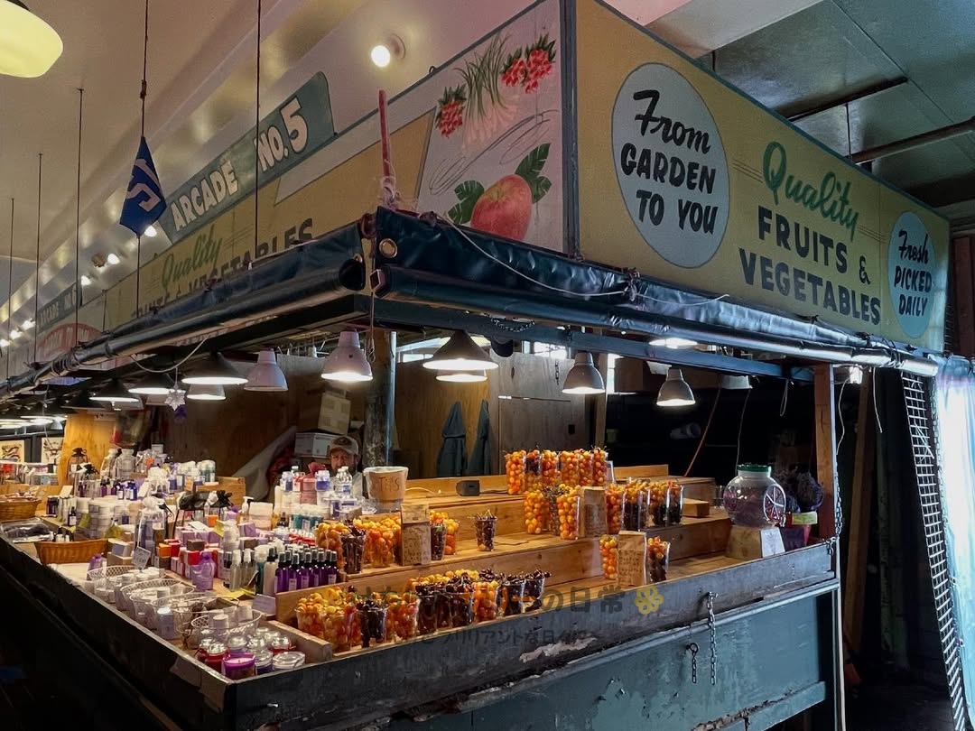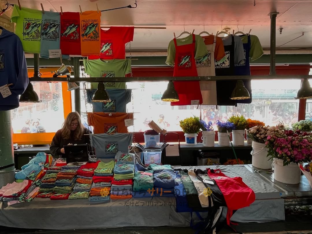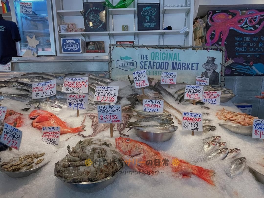 シアトル観光のハイライトになっているパイクプレイスマーケット。個性的なお店がたくさんあって見ているだけでも面白いんだけど、サリーと相方はいろんなお店で試食させてもらったり店員さんと会話したりと、現地の人との交流も楽しんだよ😁